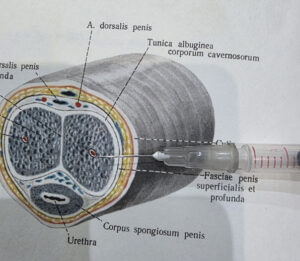 Rycina. Schematycznie przedstawienie iniekcji na tle przekroju przez prącie. Wstrzyknięcie dokonuje się prostopadle z boku do ciała jamistego.